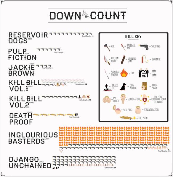 Con una certa approssimazione (chi riuscirebbe mai, per fare un esempio, a contare i ninja decapitati in Kill Bill Vol. 1?), un’infografica sui morti nei film di Tarantino.
