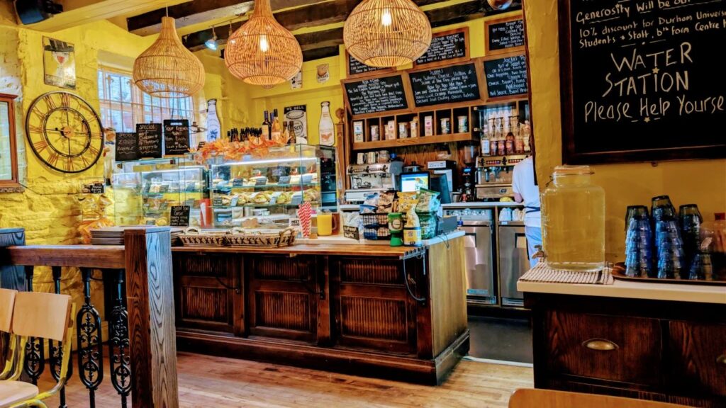 Buoni propositi. Mi ero ripromesso stamane un solo caffè, doppio magari ma non di più. Davvero. Poi come accade spesso a vagolare in giro, ed è un po’ il senso della cosa, vedo tre persone che si infilano decise in un vicolino a sorpresa che non avevo notato e solo allora faccio caso a un cartello: Vennels café, the quirky café in Durham, ovvio che vado. Per un caffè e basta, al massimo doppio. Poi sì rivela essere davvero quirky, cioè inaspettato, particolare, nascosto, ed è un posto così: