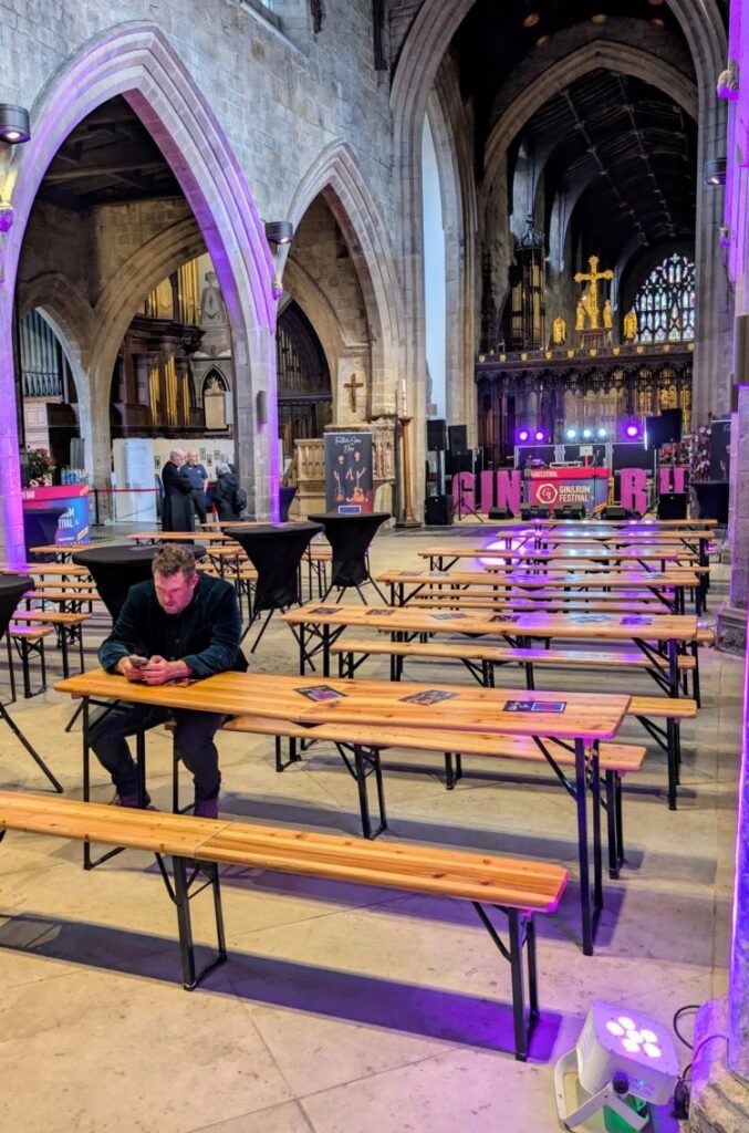 Dentro. Non è dismessa, eh. Al posto dei banchi ci sono i tavoli da birreria, nelle navate i banchi dei bar e le bottiglie, fuori una coda da qua a là che promette una grande raccolta di fondi.