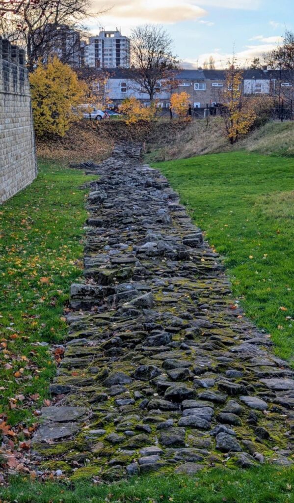 Tornando in città con la metro mi fermo a Segedunun, l’attuale Wallsend, lo dice il nome: la testa, o la coda, del Vallo di Adriano, ovvero un forte da cui si dipartiva la fortificazione, un edificio termale, il miglio zero. Il Vallo va inteso non come una poderosa muraglia, a volte non è molto più che un muro, quanto più una successione di forti e torri munite, a guardia del limes (che in latino è propriamente il confine fortificato, limes, limitis, diverso dal limen). Le dimensioni del forte sono ragguardevoli, la presenza delle terme indica ricchezza, tutto quanto è in condizioni che direi pietose.