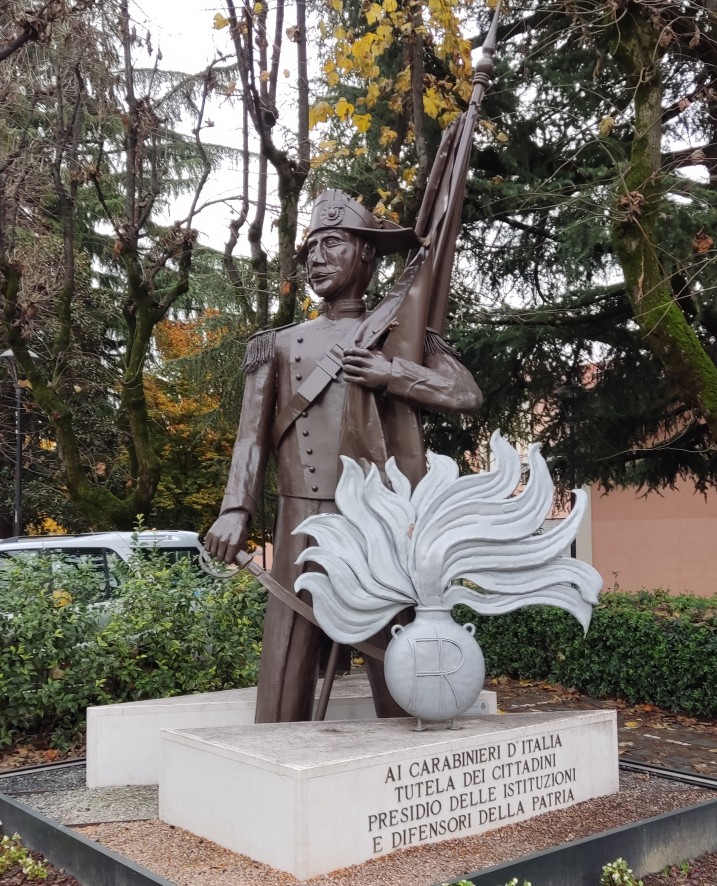 Il volto ovale, il baffo cartoonesco, il braccio snodabile, la gamba tagliata, l’otre infiammato, la legnosità complessiva rimandano più a Pinocchio – e poi ti dichiaran pazzo – che all’Arma sugli attenti, nell’esercizio delle proprie funzioni. Certo, dovrebbero essere in coppia, due almeno, come le migliori barzellette raccomandano: uno fa una cosa, l’altro l’altra. E in due, fanno uno. Ma anche per la scorta, uno di qua e uno di là. Tra l’altro, oltre ad avere fattezze da disegno, questo carabiniere sembra pure di cioccolata, verrebbe voglia di dare uno sgagno. Che non sta bene, a un rappresentante dell’Arma.