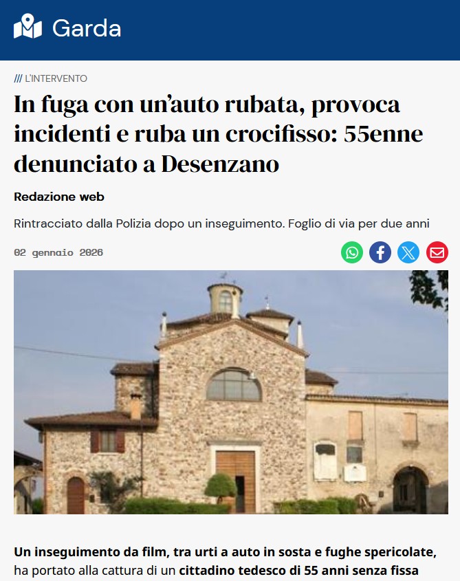 Fino all’auto e agli urti e incidenti va bene, ma il crocifisso no, santiddio. Chiaro che doveva essere uno spostato visigoto barbaro nomade senza una casa benedetta dal signore, ovvio. Mi piace la pena: «il questore ha disposto il foglio di via con divieto di ritorno nel Comune per due anni» che, leggendo, mi pare si riferisca a Desenzano. Però il crocifisso l’ha portato via dal Santuario di Lonato del Garda, come la mettiamo? Ci pensa il Signore? Che poi, certo, è dappertutto, ma sarà tornato a casa?