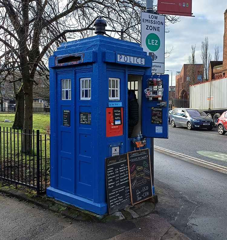 Intanto è in ‘low emission zone’ e già sarebbe molto. Ian, il simpatico gestore, ha acquistato chissà come, forse occupato?, uno stabbiotto della polizia e ne ha fatto un caffè con tutte le sue cose giuste: Speciality Coffee, Luxury Hot Chocolate, Batch Brew, Herbal Tea e poi anche qualche bevanda, biscotti, i locali Tunnock’s dolci e con la bella stagione anche un tavolino con due sedie. Per ovvie ragioni vicino alla zona di passaggio, impossibile non fermarmi. Il dentro è suo, ci sta a malapena lui con qualche macchinetta e arnese tutto organizzato al decimetro. Dopo due chiacchiere, non ho avuto il coraggio di chiedergli una foto a viso aperto e gliel’ho fatta di sfroso e di sguincio, questa sopra. Ian e il suo caffè poliziottesco stanno al 2 di Cathedral Square a Glasgow, nel senso che dopo pochi metri si può visitare la cattedrale di San Mungo – lo so, viene anche a me da fare il pirla ogni volta ma sto zitto – e da lì il clamoroso cimitero monumentale vittoriano di Glasgow, la Glasgow Necropolis. C’è tutto l’armamentario romantico: la collina sulla città, l’erba rigogliosa, le tombe sontuose e quelle crollate, i vialetti fangosi senza ordine, il ponte dei sospiri e, come sempre accade, i sepolcri dicono molto del posto, ricchi armatori più di tutto in città, gente che fece fortuna con la rivoluzione industriale, indimenticabili mogli e figlie morte forse a sedici anni di tubercolosi o scarlattina ma con quante virtù, militari e ammiraglioni, infine il teologo scozzese Knox. Come si dice in città: «Glasgow è un po’ come Nashville: non si occupa più di tanto dei vivi, ma i morti li cura davvero». Scendendo dalla necropoli, c’è proprio sotto la fabbrica della Tennent’s, che sta lì a far la birra dal 1556 e se qualcuno lo desidera può venir via con un’autobotte di lager. Il marchio promosse un festival musicale, il ‘T in the Park’, dal 1994 al 2017. Faccio un esempio. Prima sera del 2002 sul palco principale in ordine inverso: Oasis, Primal Scream, Gomez, No Doubt, Starsailor, The Dandy Warhols, The Polyphonic Spree, Proud Mary e poi l’a-me-ignoto DJ Arthur Baker; sui palchi secondari, alla rinfusa: Badly Drawn Boy, Morcheeba, Basement Jaxx, Idlewild, Joe Strummer & The Mescaleros, The Coral, Groove Armada. Credo ci siamo capiti. Seconda sera: The Chemical Brothers, Foo Fighters, Green Day, The Hives, Jimmy Eat World, Mull Historical Society, Beverley Knight e l’ancora ignoto DJ Arthur Baker. E sui secondari: The Beta Band, Mercury Rev, Sonic Youth, Air, Orbital. Ma bisogna essere onesti e dirla tutta: anche certi Marco & Gaetano, va’ a sapere.