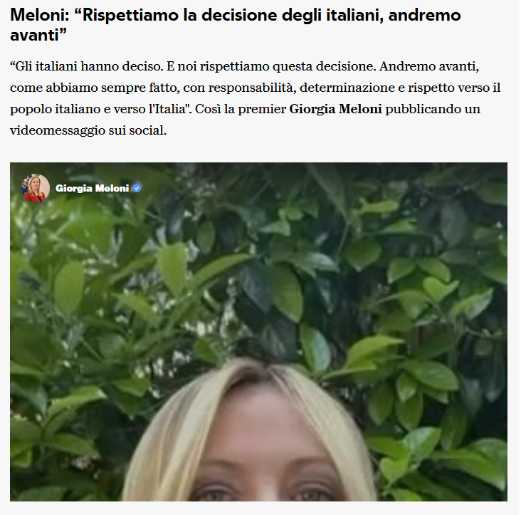 Meloni dice: «Gli italiani hanno deciso. E noi rispettiamo questa decisione» e vorrei ben vedere non lo facessero, ma chissà quanto rosica. A me piace il taglio dell’immagine del videomessaggio su Repubblica: