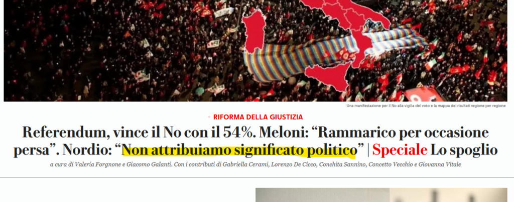 «Ce l’abbiamo messa tutta» detta dal Comitato del Sì sa molto di resa. Mmm, sta’ fermo, trivigante, che la notte del 2008 te la sogni ancora. Tutto è molto veloce, in Campania il ‘no’ al sessantasei per cento. Sta’ a vedere che anche questa si smalta sul referendum confermativo. Poi arriva una dichiarazione chiarissima: FdI nella presenza di un tizio dice che «L’esito non incide sul governo».