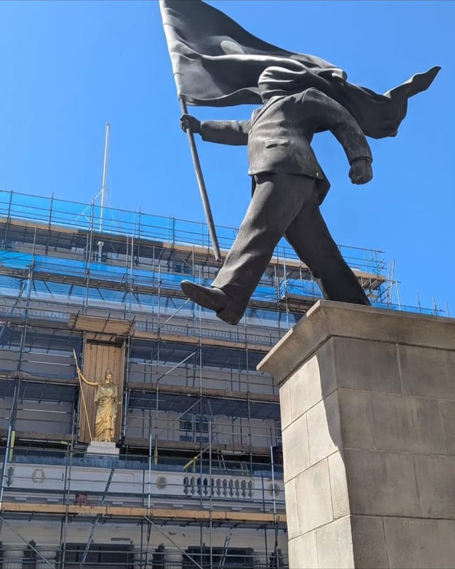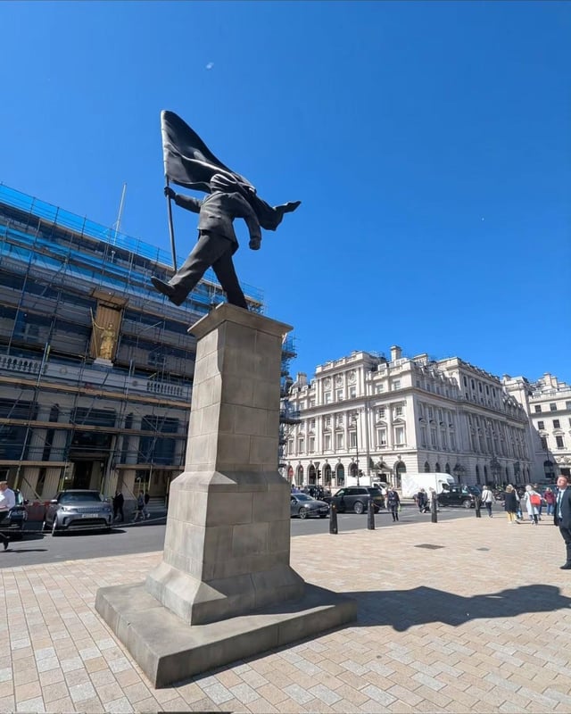 La statua è un bell’inedito, qualcosa si era visto a Dismaland. Per quanto immagino di resina e non troppo pesante, andarla a collocare lungo il Pall Mall, proprio al centro di Waterloo Place, ovvero in centrissimo a Londra è un ennesimo bel colpo. È stata una settimana complessa proprio per questioni di bandiere, questa, e di ottuso nazionalismo predatorio – e poi diciamo dei fanatici islamisti -, per cui non poteva cadere in momento più opportuno.